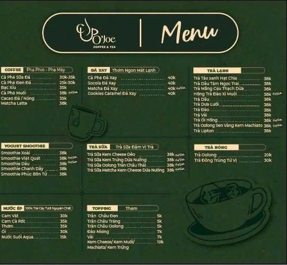 Cup O’Joe Cà Phê phục vụ đa dạng các loại đồ uống và món ăn nhẹ phù hợp cho nhiều sở thích. Một vài gợi ý bạn có thể thử: