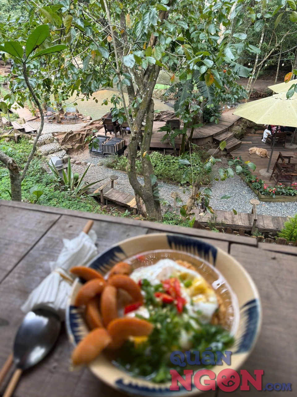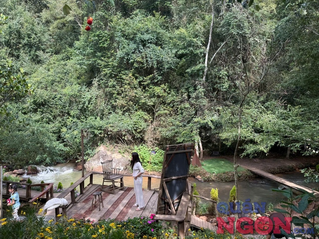 Quán có nhiều góc “sống ảo” siêu đẹp: chiếc cầu gỗ nhỏ bắc ngang qua suối, bàn ghế mộc mạc ngay sát mép nước, hay mái hiên gỗ nhìn ra vườn hoa. Mỗi góc đều rất nên thơ, chỉ cần đưa máy lên là có ảnh đẹp mang về.